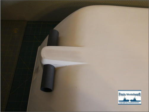 dann mit den Bohrungen für die Befestigung der Kortdüse und Ruder bestückt habe. Die beiden Ruder habe ich aus 6 mm PVC ausgesägt und dann mit einem