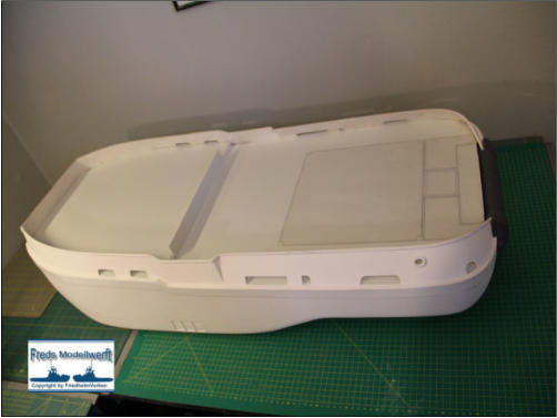deck habe ich mir eine Kopie der Deckansicht vom Plan auf Pergamentpapier erstellt, und sie dann auf die zugeschnittene Polystyrolplatte übertragen.