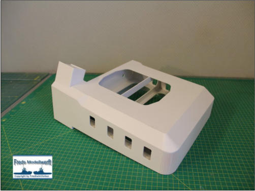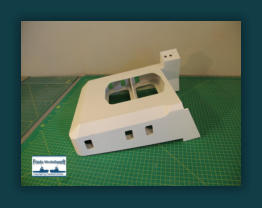 Der untere Aufbau mit Schornstein besteht aus 2 mm Polystyrol. Die vorderen oberen Dreieckteile werden durch Füllstücke ergänzt und angepasst.