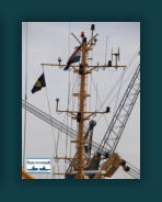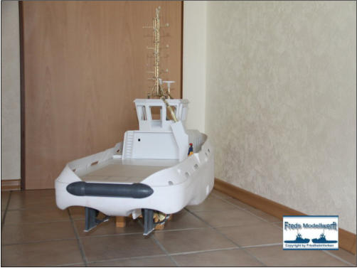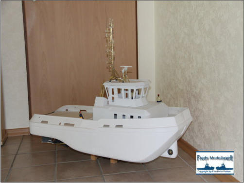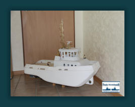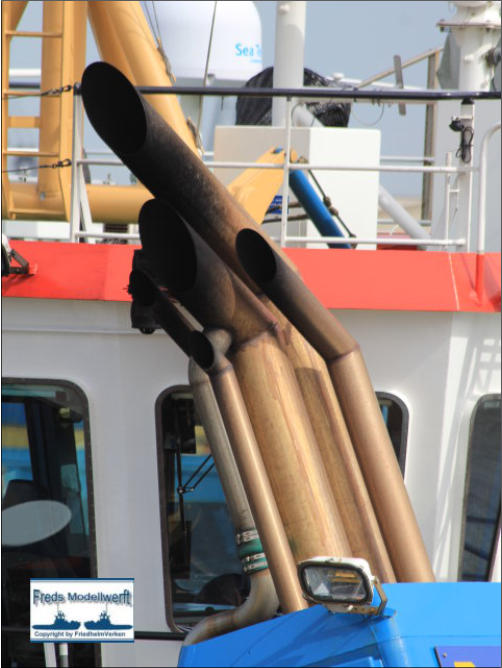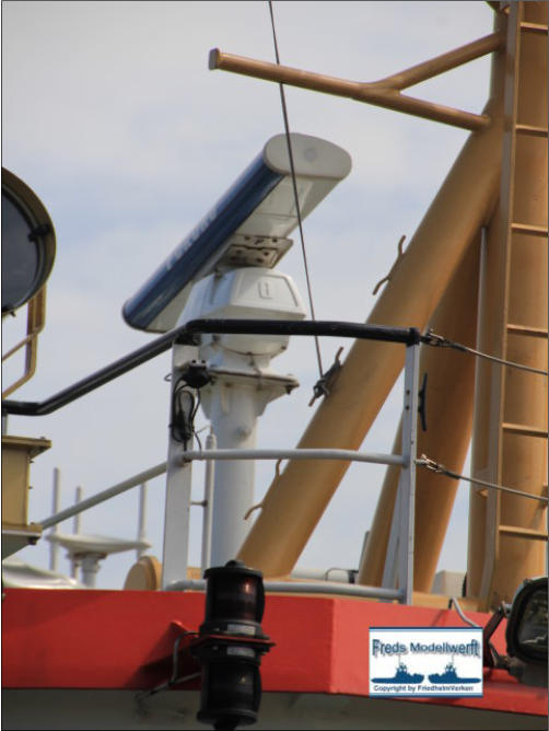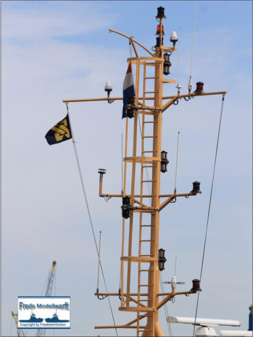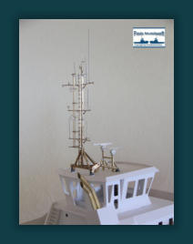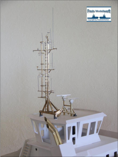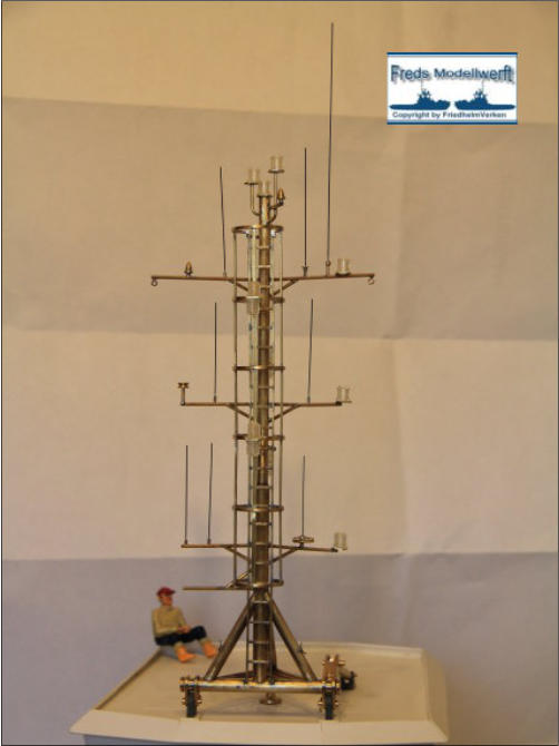 Die größeren Teile des Antennenmast wurden hart und die kleinen Teile weich gelötet. Dies hatte den Vorteil, dass beim Anbringen der Kleinteile die Großen auf Grund der höheren Löttemperatur nicht wieder auseinander gingen. Um benachbarte Kleinteile beim Löten vor dem Abfallen zu schützen, hilft eine Metallklemme. Diese lenkt die “Hitze” auf sich und schützt so das Kleinteil. Der fertige Antennenmast wurde vom 1. Maschinisten “abgenommen” ;-)Radarmast und die beiden großen Kamine wurden ebenfalls aus Messingrohr mit einander hart verlötet.