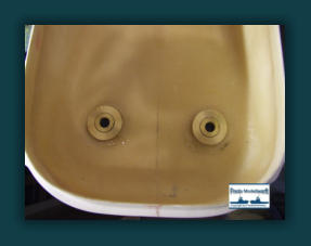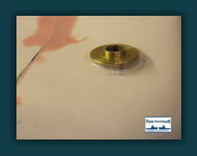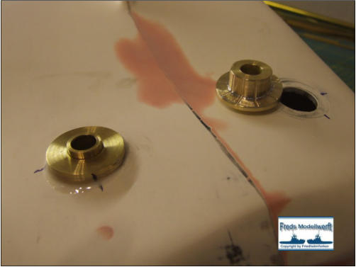 Wie man  bei einem einen Glasfaserrumpf die äußerlichen Unebenheiten mit Autospachtel ( Prestolith ) und Schmirgelpapier bearbeitet möchte ich hier nicht  weiter vertiefen, (schmirgeln ...schleifen ...schmirgeln...). Danach setzte ich in den “glatten” Rumpf die beiden Führungsbuchsen für die beiden Schottelantriebe ein. Wobei die Unteren an der Rumpfform angepasst werden mussten, da die Schottel schließlich nicht wie X-Beine aussehen sollten.