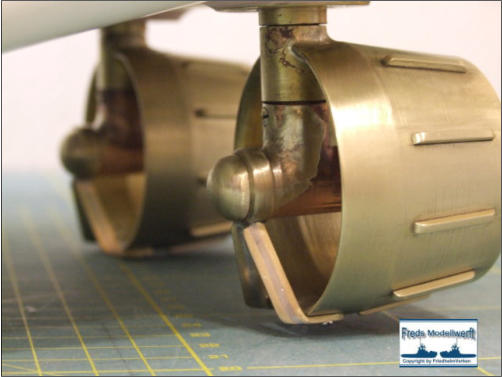 Bei den Kortdüsen befestigte ich rundherum die Opferanoden . Dafür verwendete ich kleine Messingstifte und ein wenig Sicherungskleber. Die Leitflügel sollten nicht nur dem Original nach gebaut sein , sie hatten auch die Aufgabe die Gondel samt Schiffspropeller vor eventuellem Verlust zu schützen. Bei den Zahnradwartungen können sie durch entfernen der zwei Befestigungsschrauben abgenommen werden. Anschließend wurden sie mit zwei 55er Fünfblatt Propeller versehen. Wie diese sehr leisen und um 360° drehbaren Schmuckstücke angetrieben und gesteuert werden, dazu kommen wir später noch.
