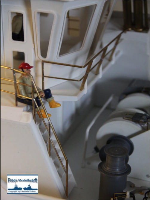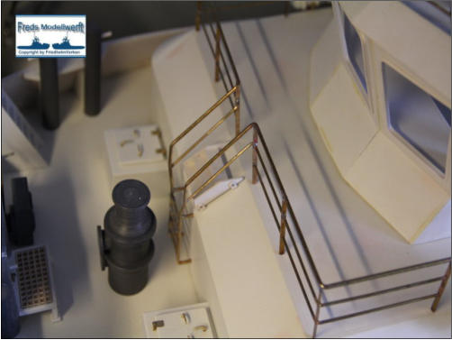 ...Über die Anfertigung von Reling und Relingstützen muss man nicht viel schreiben...Das die obere Reling immer 0,5 mm dicker ist, der Optik wegen, braucht man auch nichtzwingend zu erwähnen. Außer das es auch hier nützlich sein kann, angrenzende Lötteilemit Metallklemmen zu versehen, um das Abfallen der zu lötenden Teile zu vermeiden.