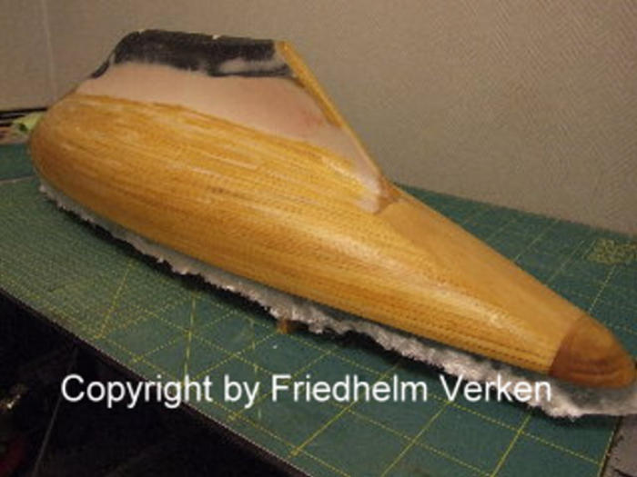 erhöhen, vergrößerte ich das Ruder um etwa 25 %. Da dies aus Polyprophylen gefertigt ist braucht es auch später nicht mit laminiert zu werden. Der Rumpf war