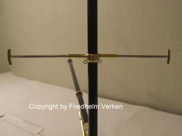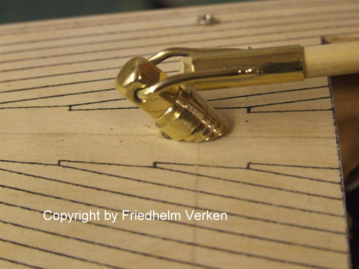 12 mm Rundmaterial eingearbeitet und mit Hilfe einer Aluminium Niete befestigt. Die beiden abnehmbaren Sailings sind in den gelöteten Messingröhrchen steckbar.