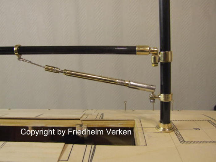 Niederholer für den Großbaum. Die gedrehten Messing Ringe und -Ösen wurden mit den Anbauteilen “ Hart “ verlötet, damit nach dem Schleifen und Polieren keine